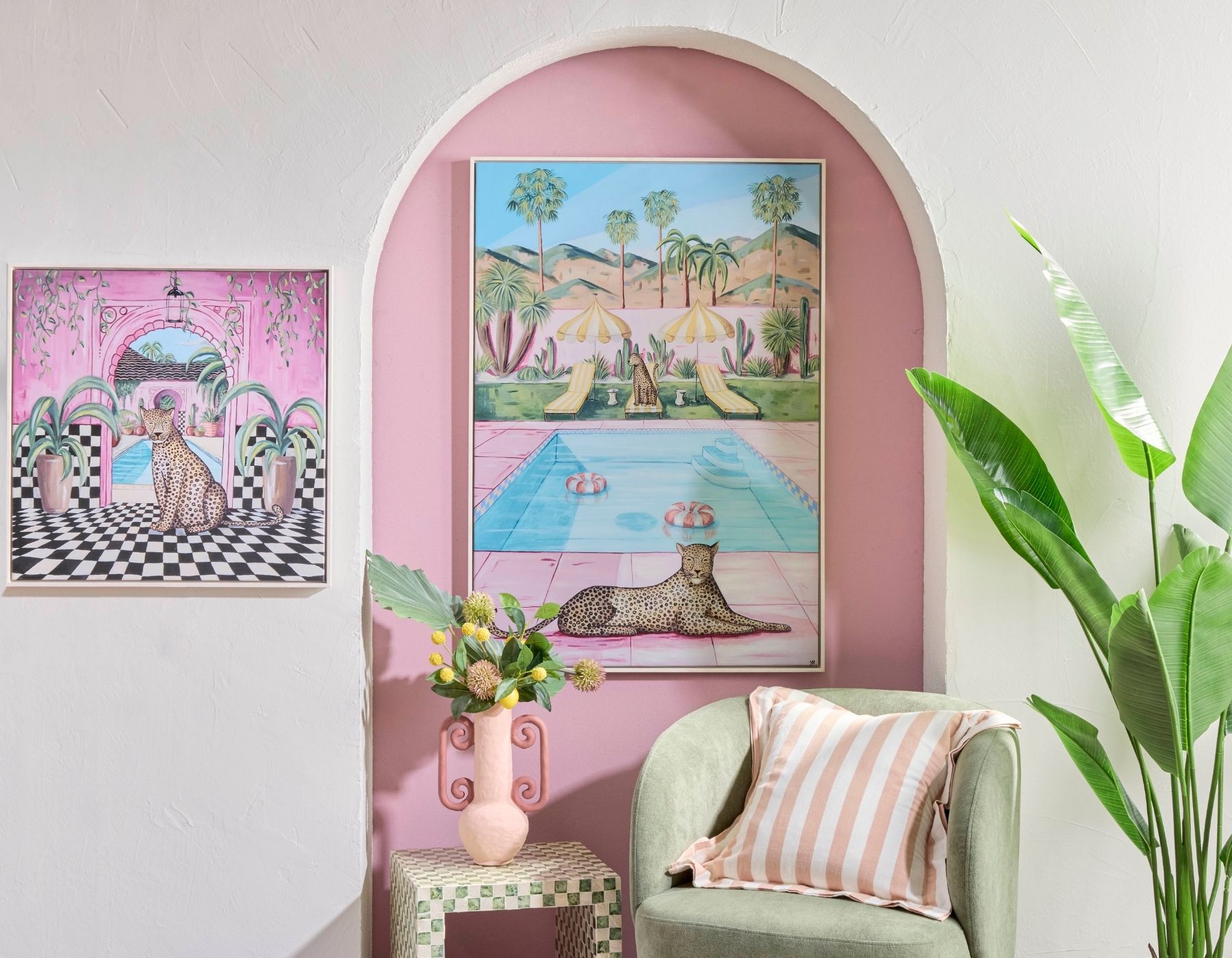 Pillow Talk has launched an exclusive collaboration with Australian artist Jo Horsley, after the brand’s team unexpectedly discovered her work at a local art show and were instantly drawn to her joyful, expressive style. That chance encounter has now been brought to life as a limited-edition wall art collection. With only two artworks in the entire collection, the Jo Horsley x Pillow Talk collaboration offers Australians a rare opportunity to bring authentic, original art into their homes – without the gallery price tag. Inspired by nature and playful escapism, the pieces transport viewers to imagined worlds featuring lounging leopards, Palm Springs poolside scenes and lush Moroccan villas.